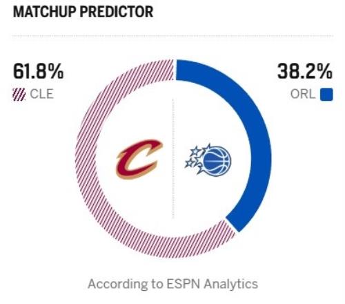 今天ESPN给出了本场胜利预测,骑士高达61.8%,魔术为38.2%。