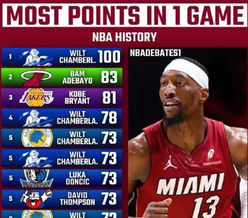 83分刷新了阿德巴约的个人生涯得分纪录,同时也超越了科比的81分,成为NBA历史第二高得分,仅次于张伯伦的单场100分。