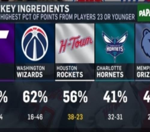 23岁及以下球员得分占比前五球队:火箭第三战绩3822不“合群”