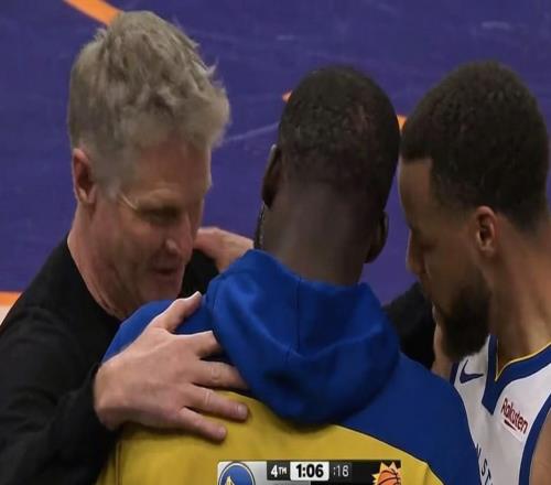 意味深长的拥抱,勇士赢球无望,科尔与库里&追梦相拥致意