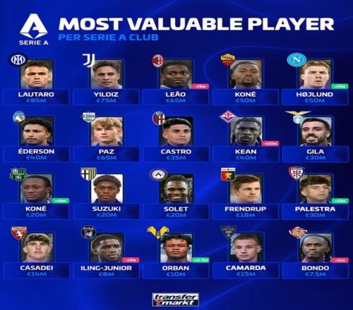 北京时间4月6日,德转列出了意甲20家俱乐部各自身价最高的球员,劳塔罗8500万欧元居首,凯南-伊尔迪兹、莱奥、霍...