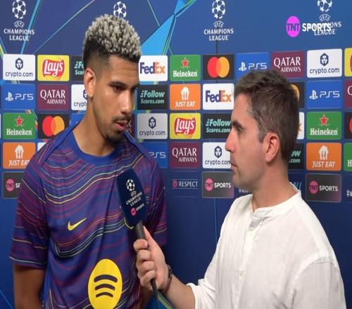 欧冠1/4决赛首回合,巴萨主场0-2输给马竞,巴萨后卫阿劳霍赛后接受了TNT体育巴西频道的采访。现在我们来采访阿...