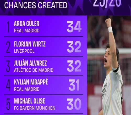 数据机构Squawka列出本赛季欧冠截至目前创造机会榜,居莱尔34次居首,维尔茨、阿尔瓦雷斯32次并列第二。本赛季...