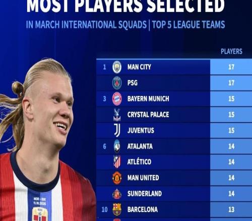 Îå´óÁªÈüÇò¶Ó±¾Ô±»Õ÷ÕÙ¹ú½ÅÊýÁ¿£ºÂü³Ç¡¢°ÍÀè17È˲¢ÁеÚÒ»