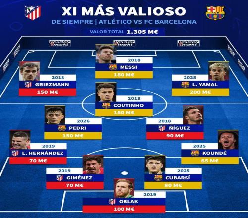 北京时间4月5日,在西甲第30轮马德里竞技和巴塞罗那迎来正面对话的情况下,德转列出了两队历史身价最高的11人阵...